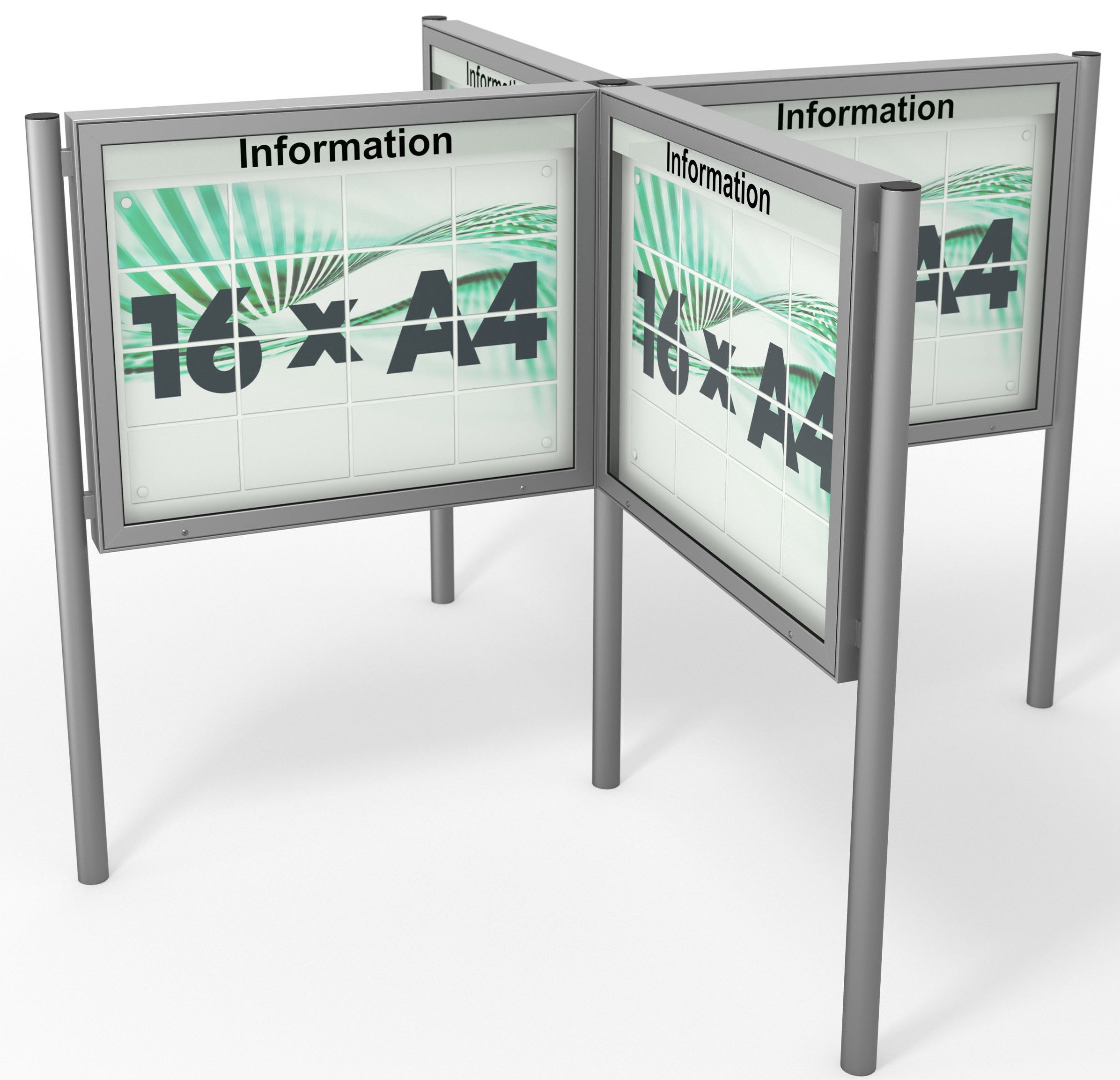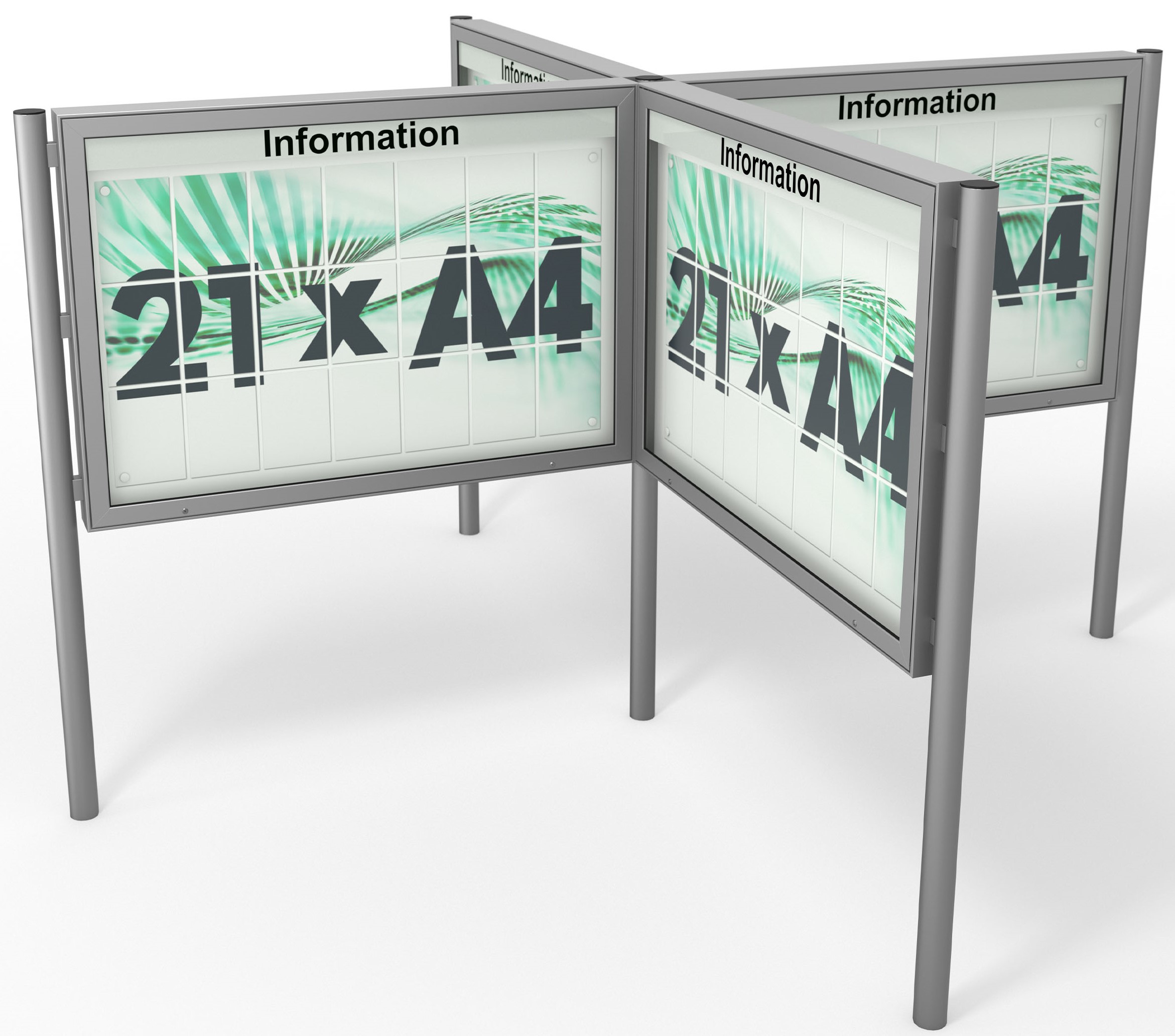 Schaukasten Plenum - eckig - 4er Sternanlage - beidseitig 123 mm Gehäusetiefe -wetterfester, robuster SchaukastenUmfangreiches Zubehör wie Beleuchtung und StänderGrößen B/H4 x 16 × DIN A4 • 1330 × 1080 mm oder4 x 21 × DIN A4 • 1600 × 1130 mm Oberfläche - Eloxierung in matt-silber (E6/EV1)Optionale Standbeine - Die Standbeine müssen 700 mm tief in Betonfundamente eingefasst werdenBeleuchtung – optionale LED-Langfeldleuchte Öffnung - Nach oben öffnender Klappflügel, unterstützt durch Gasdruckfedern mit automatischer Arretierung in geöffneter StellungVerglasung - Einscheiben-Sicherheitsglas / ESG Textblende - unbeschriftete, weiße Acryl-TextblendeSchließung - Sicherheitsschlösser mit je 2 SchlüsselnMontage - Vorgerichtet zur Wandmontage - freistehend mit runden Standbeinen zum EinbetonierenRückwand - weiße, magnethaftende Rückwand mit 10 Magneten